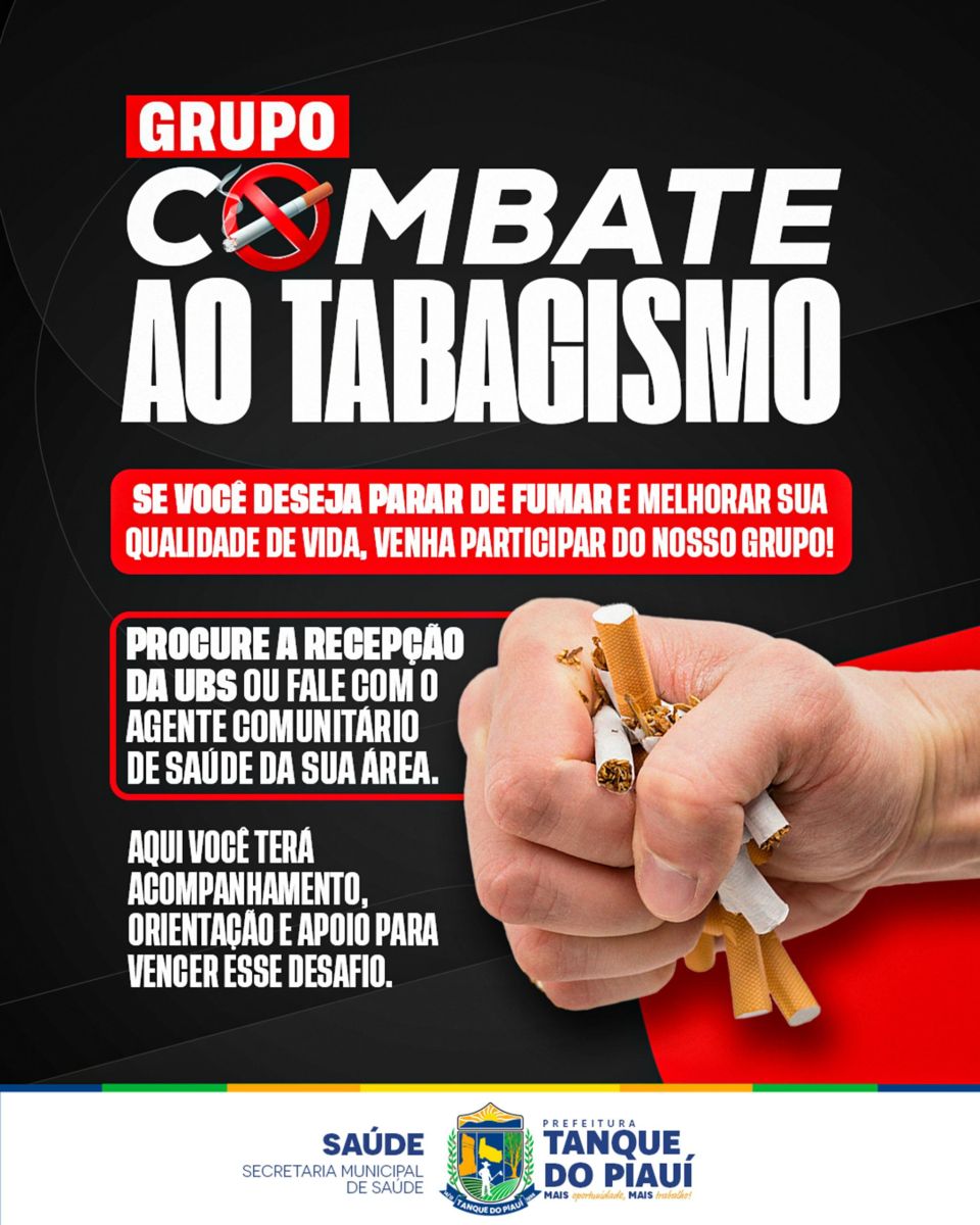 Se você deseja parar de fumar e melhorar sua qualidade de vida, a Secretaria Municipal de Saúde de Tanque do Piauí oferece acompanhamento, orientação e apoio por meio do nosso grupo de combate ao tabagismo.
