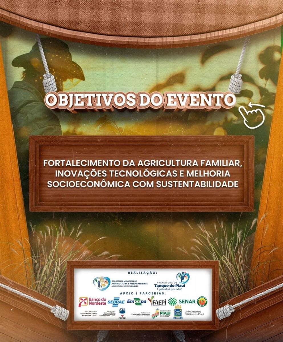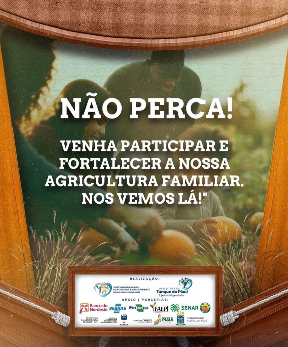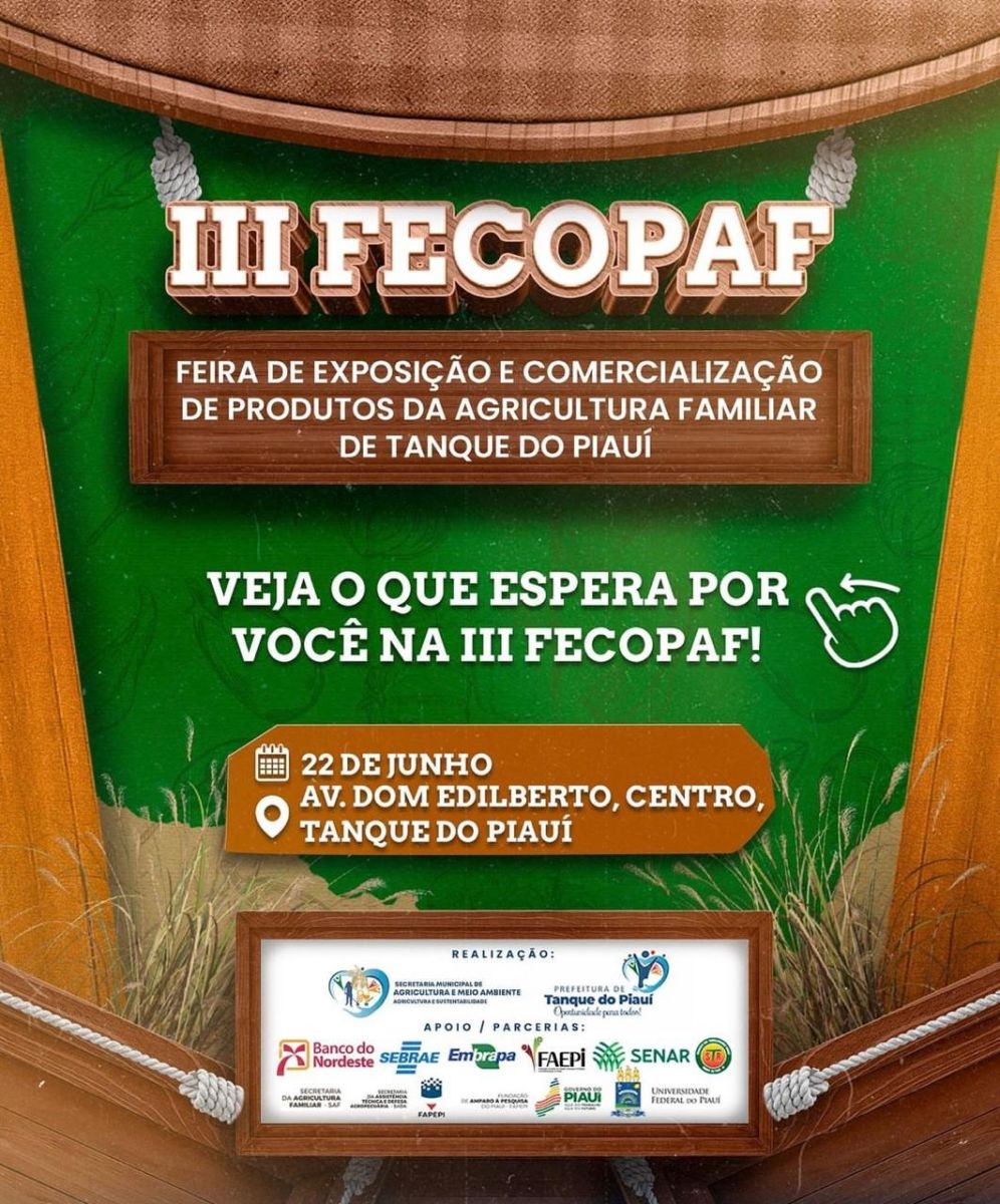 A Prefeitura de Tanque do Piauí, através da Secretaria Municipal de Agricultura e Meio Ambiente, tem o prazer de anunciar a III Feira de Exposição e Comercialização de Produtos da Agricultura Familiar de Tanque do Piauí!